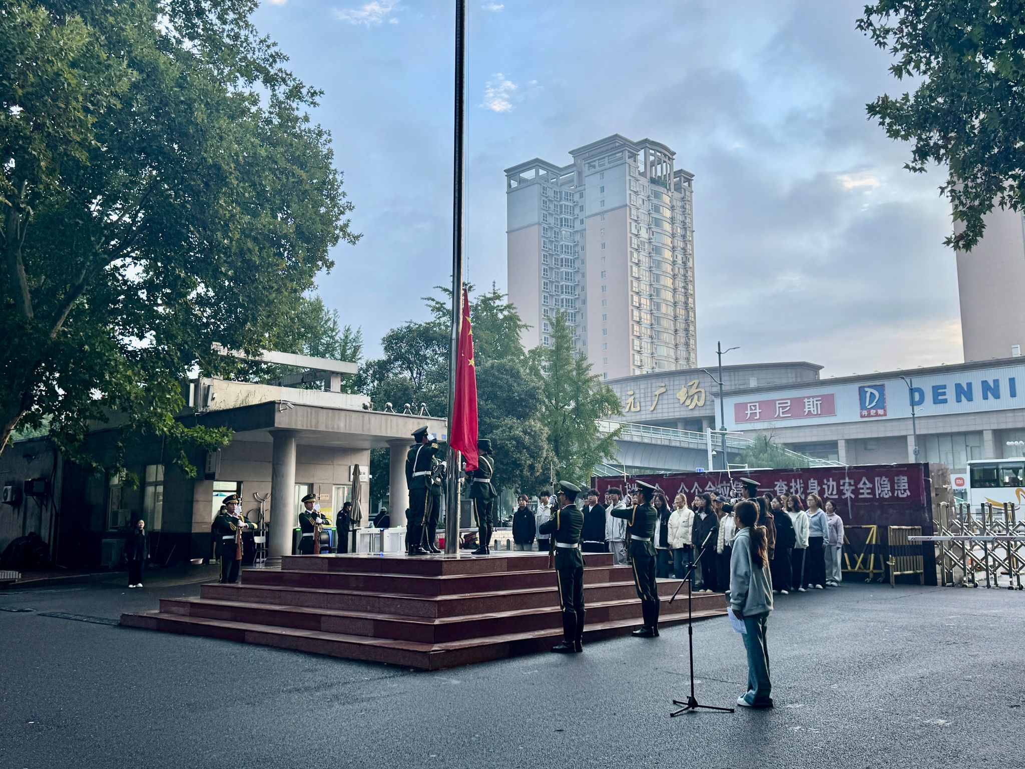 10月13日,谈球吧官网在花园路校区举行升旗仪式,全体学管老师和2025级在校学生参加。