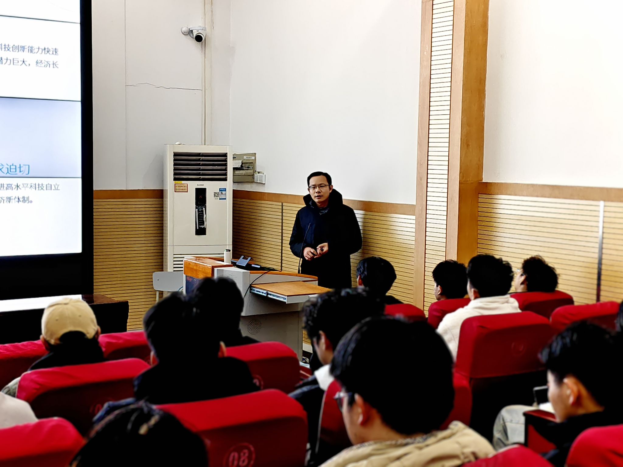 课上,张军锋首先从“十五五”规划的历史背景与战略定位切入,指出当前全球治理体系深度调整、科技革命加速演进,而我国正处于高质量发展关键阶段。他强调,规划既是巩固第一个百年奋斗成果的行动纲领,也是实现2035年基本现代化的开局之举,其核心在于推动创新驱动、绿色转型与国家治理现代化。结合规划目标,详细解析了经济增速、社会民生、可持续发展三大体系。他提到,2024年我国第三产业占比达56.7%,研发投入强度突破2.69%,彰显经济结构优化与创新能力的提升;同时,规划明确提出就业优先、收入分配优化、公共服务均等化等民生目标,要求学生干部关注社会需求,强化责任担当。