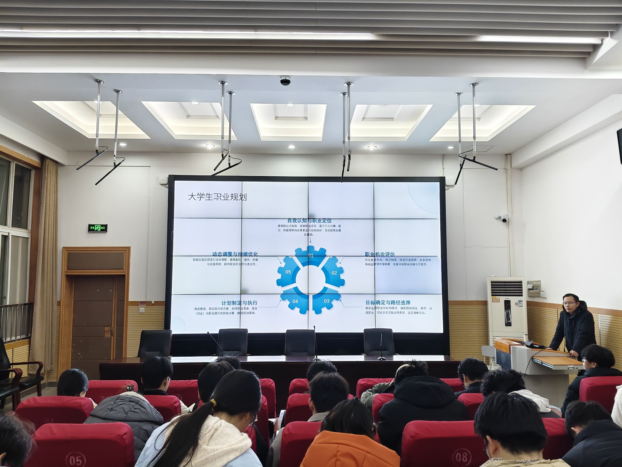 针对大学生职业规划,张军锋提出“自我认知—目标选择—动态调整”的闭环路径。他建议学生基于兴趣、能力与价值观进行职业定位,结合行业趋势、企业规模等因素,全面分析职业环境与可能性从而设定目标,并通过W分析法、SWOT分析法等工具科学评估机遇与挑战。他特别强调,规划实施将创造大量高质量就业岗位,鼓励学生提升技能、拥抱绿色经济与数字经济等新业态。